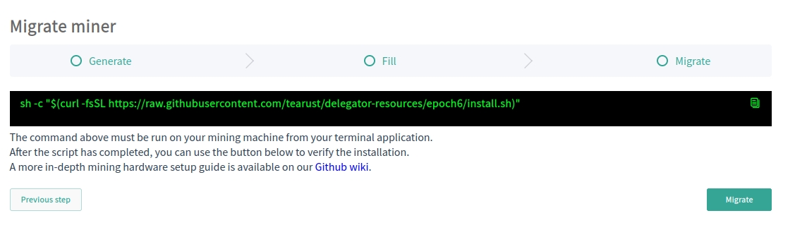 Moving onto the final Migrate step, you'll have to copy the shell script command and run it on the terminal of your new mining machine. After the script has finished running (the terminal output finishes with a docker start completed